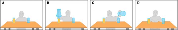 Para evaluar si Kanzi poseía esta facultad, los investigadores organizaron una supuesta merienda con vasos y platos vacíos. En una prueba, fingieron servir jugo en dos vasos y luego simularon vaciar uno. Cuando le preguntaron dónde estaba el jugo, Kanzi señaló correctamente el vaso que «seguía lleno» en el juego.