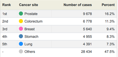 Este informe categorizó el ranking de cánceres a nivel nacional, en una primera instancia clasificándolos por sexo, para luego unificar la información. En este cuadro comparativo de ambos sexos, el estudio reveló que el 16,2%, es decir, el cáncer con mayor incidencia a nivel nacional para ambos sexos es el cáncer de próstata, seguido por un 11,3% correspondiente al cáncer colorrectal, y en un tercer lugar el cáncer de mama con el 9,4%.
